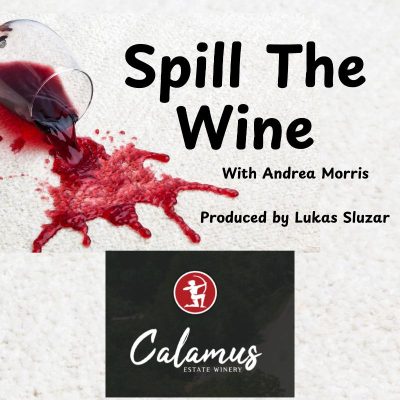 Hello, friends. I’m Andrea Morris, and welcome to another episode of Spill the Wine, a podcast about wine. Yay. Where we get to enjoy wine with friends and also learn that you don’t have to know a whole lot about it to enjoy it. But part of the journey of this podcast is actually teaching you about various things about wine as we go along, and introducing you to some really great wineries in the Niagara Region. And on this episode, we are visiting an a really cool winery called Calamus. I am here with Peter. Hi, Peter.